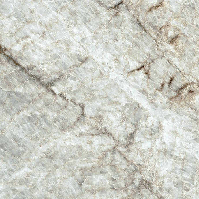 Wilsonart sheet laminate, 5074 Arctic Mahal features a striking diagonal quartzite design, with a cool grey base accented by white crystallized fractures and warm brown veins.